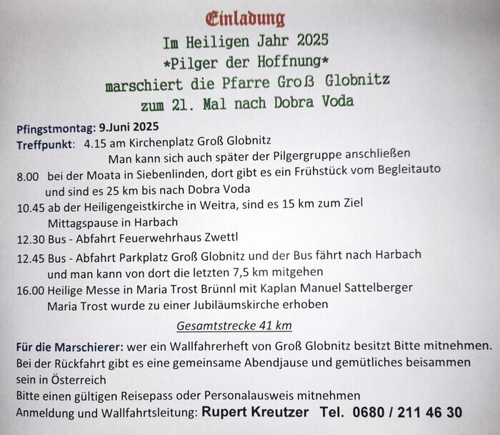 Daher herzliche Einladung zur 21. Fußwallfahrt nach Dobra Voda!